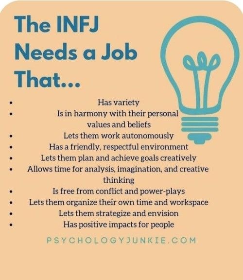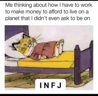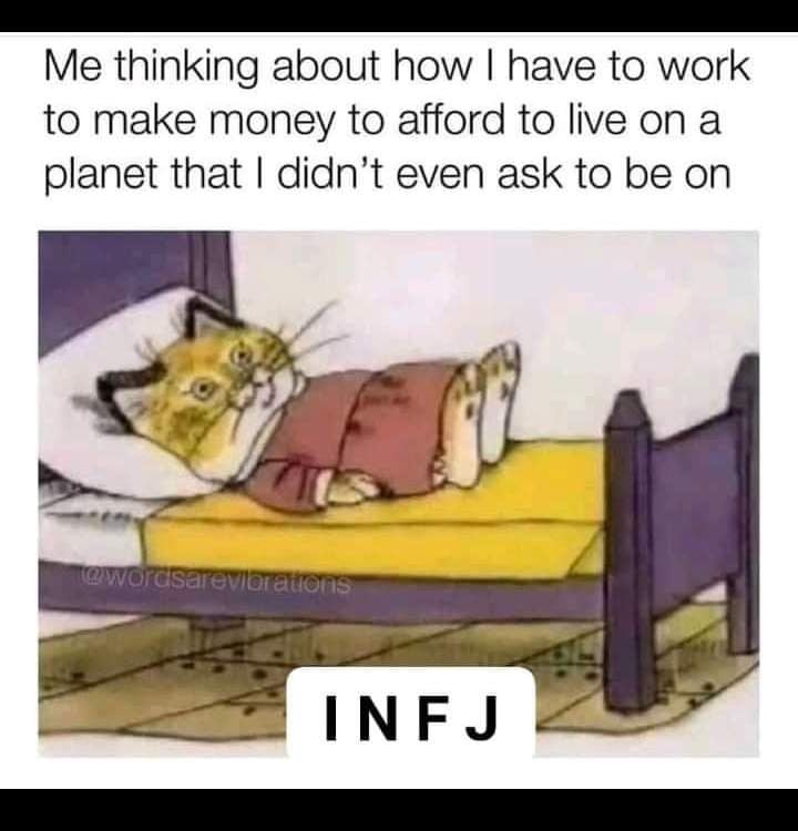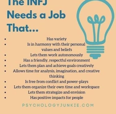 Vì là tuýp người lý tưởng hoá, có những tiêu chuẩn về giá trị, sự nhân văn có lẽ là "trên trời" và không thực dụng trong xã hội ngày nay, nên công việc kiếm tiền nếu không tạo được sự hứng thú đam mê với INFJ thì tụi mình sẽ cảm thấy rất khó khăn để đi làm. Công việc lúc đó trở thành một chướng ngại, một sự khổ sở, một nỗi đau khổ. Điều này có lẽ đúng với tất cả mọi tuýp tính cách nhưng nó lớn hơn và sâu sắc hơn rất nhiều đối với INFJ người luôn đặt ý nghĩa và sự tốt đẹp vào công việc mình làm.
