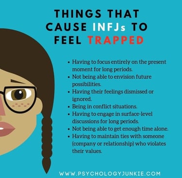 Cảm xúc, giá trị tinh thần và nhìn được toàn cảnh vấn đề để lên đường đi nước bước cho tương lai là vô cùng quan trọng với INFJ. Do vậy những thứ khiến INFJ cảm thấy bị mắc kẹt là: