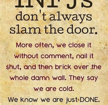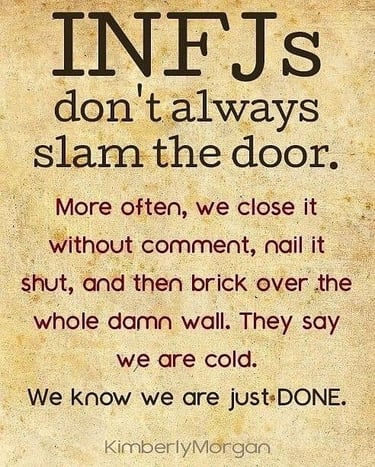INFJ dường như nổi tiếng với cụm từ "INFJ door slam" - cú đóng rầm cửa của INFJ. Nghĩa là chúng mình sẽ đột ngột cắt đứt liên hệ với ai đó, mà không cho người ta cơ hội để thanh minh giải thích gì, khi tình trạng của người kia là quá tệ hại, không thể chịu đựng được đối với chúng mình.