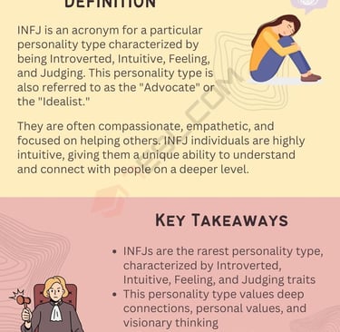 INFJ là viết tắt của 1 kiểu tính cách đặc trưng bởi Hướng nội, Trực giác, Cảm xúc và Óc phán đoán. Kiểu tính cách này thường được gọi là "Người cố vấn" hoặc "Người lý tưởng hoá".