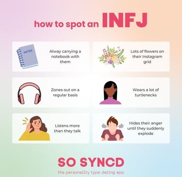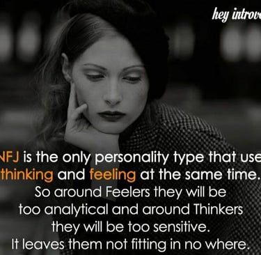 INFJ là kiểu tính cách duy nhất mà sử dụng suy nghĩ và cảm xúc cùng một thời điểm. Vì vậy khi ở bên những Người cảm nhận (có chữ F trong kiểu tính cách), INFJ sẽ bị coi là quá phân tích, và khi ở bên những Người suy nghĩ (có chữ T trong tên kiểu tính cách) thì INFJ sẽ bị coi là quá nhạy cảm.