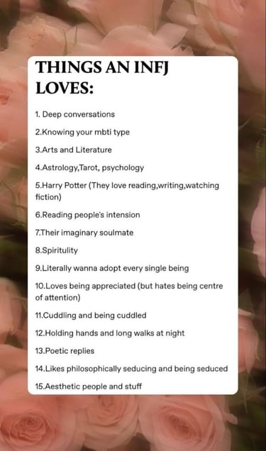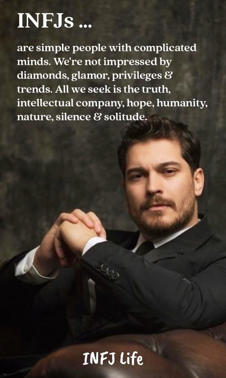 INFJ là những người đơn giản có đầu óc phức tạp. Chúng tôi không bị ấn tưởng bởi kim cương, vẻ hào nhoáng, đặc quyền đặc lợi hay xu hướng. Tất cả những gì chúng tôi tìm kiếm là sự thật, tình bạn thông thái, niềm hy vọng, sự nhân văn, thiên nhiên, sự yên lặng và tĩnh mịch.