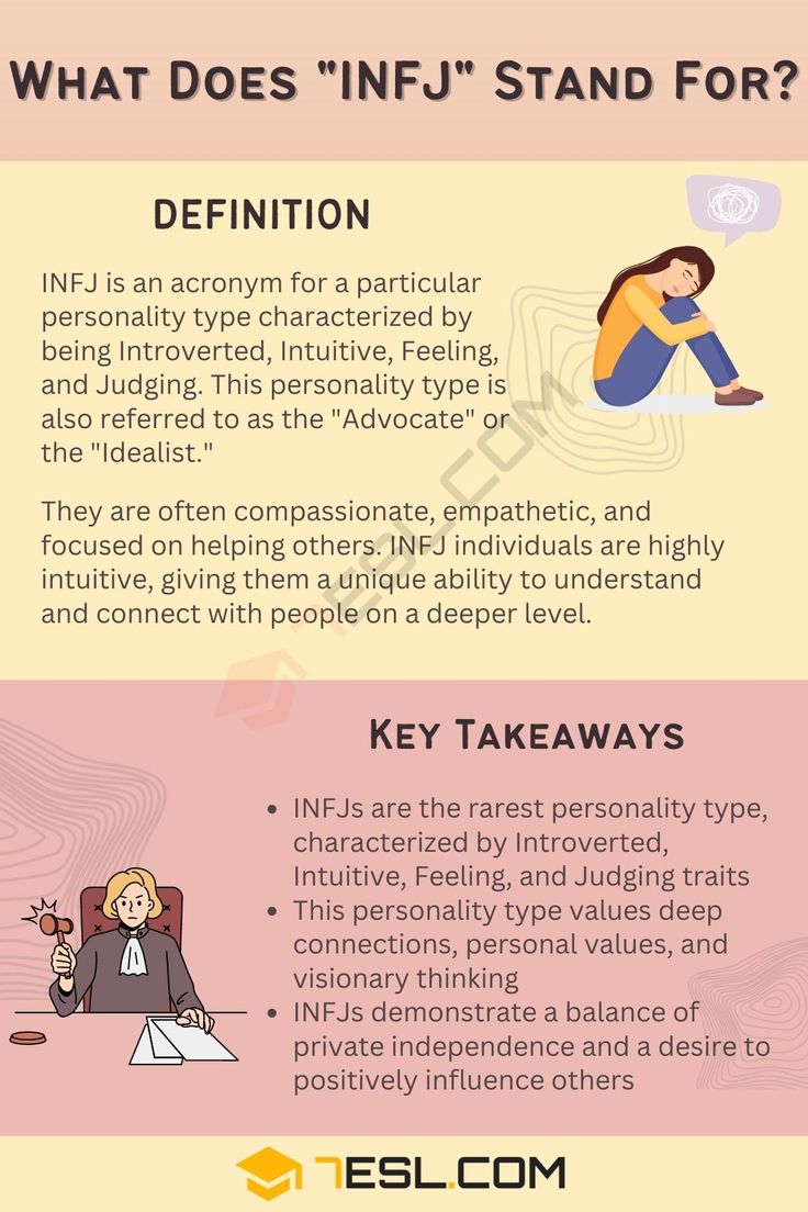 INFJ viết tắt của 4 từ: Introversion (hướng nội), iNtuition (trực giác), Feeling (cảm xúc), Judgement (óc phán đoán)