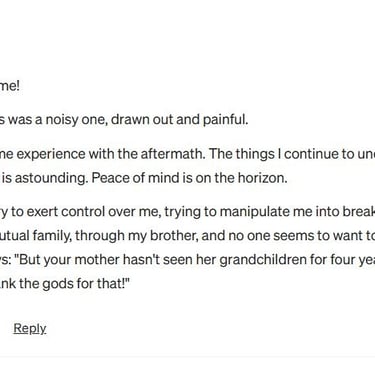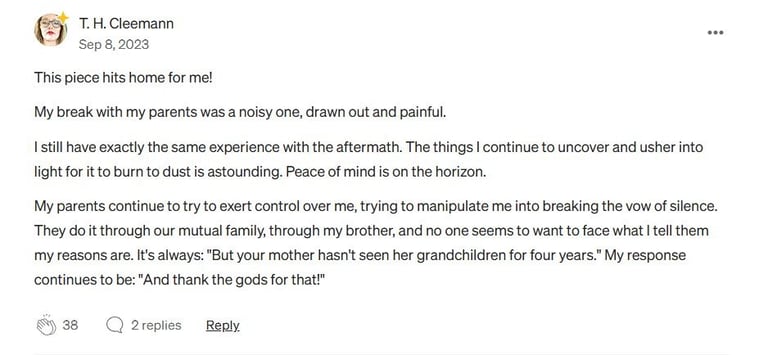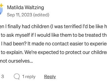Khi tôi có con (tôi vô cùng sợ tôi sẽ trở thành 1 người mẹ giống như bà ấy), tôi đã hỏi bản thân mình rằng tôi có muốn con tôi bị đối xử theo cách mà tôi đã bị mẹ tôi đối xử không? Việc cắt liên lạc giúp cho trải nghiệm dễ dàng hơn và cũng dễ để giải thích được mọi thứ hơn. Chúng ta dường như được mong đợi là sẽ bảo vệ con cái của mình chứ không phải bảo vệ chính mình...