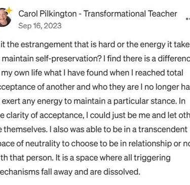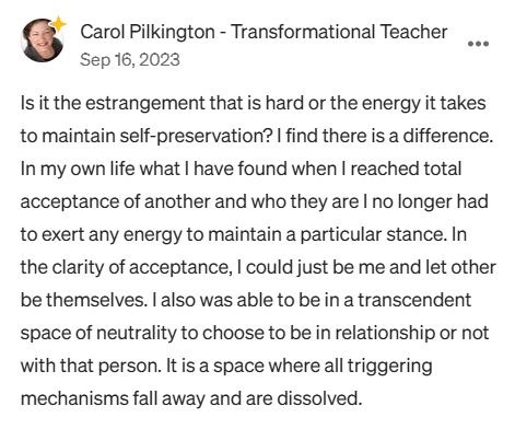 Có phải việc cắt kết nối là khó khăn hay năng lượng cần có để duy trì sự tự bảo vệ mình là khó khăn? Tôi thấy có sự khác biệt giữa 2 cái đó. Trong cuộc sống của riêng tôi, điều tôi nhận ra khi tôi đạt được sự chấp nhận hoàn toàn đối với người khác và con người của họ là tôi không còn phải dùng bất kỳ năng lượng nào để duy trì một lập trường cụ thể nào của mình nữa. Trong sự sáng suốt của sự chấp nhận, tôi chỉ có thể là chính mình và để người khác là chính họ. Tôi cũng có thể ở trong một không gian siêu việt của sự trung lập để lựa chọn có mối quan hệ hay không với người đó. Đó là một không gian mà tất cả các cơ chế kích hoạt khơi gợi chấn thương tâm lý của chúng ta đều bị biến mất.