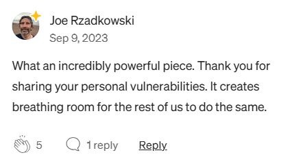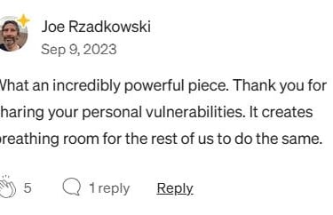 Thật là một bài viết vô cùng mạnh mẽ. Cảm ơn bạn đã chia sẻ những điểm yếu rất riêng tư của bạn. Nó tạo ra không gian thoải mái để những người khác trong chúng ta cũng làm được tương tự như vậy.