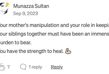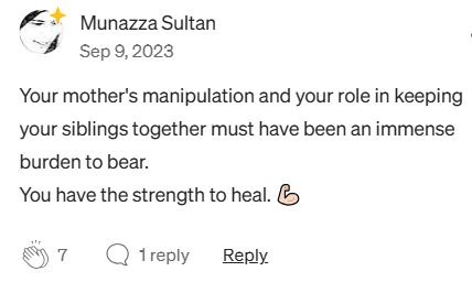 Sau khi tôi rời đi khỏi gia đình, tôi không thường xuyên chia sẻ câu chuyện của mình cho mọi người biết. Tôi không cố tình ra vẻ đạo đức khi tôi tỏ ra bối rối trước sự ngưỡng mộ thực sự của những người nghe thấy và biết rằng tôi chọn giữ liên lạc với — thậm chí là gần gũi — mẹ tôi. Tuy nhiên, khi tôi cố gắng đưa ra một điểm cân bằng cảm xúc cho nỗi kinh hoàng của câu chuyện bằng cách chỉ ra điều tích cực (là tôi! thật là bất khuất, phải không?!), tôi đã đón nhận một cách biết ơn sự tôn trọng bối rối mà những người bạn tâm giao dành cho mình.