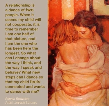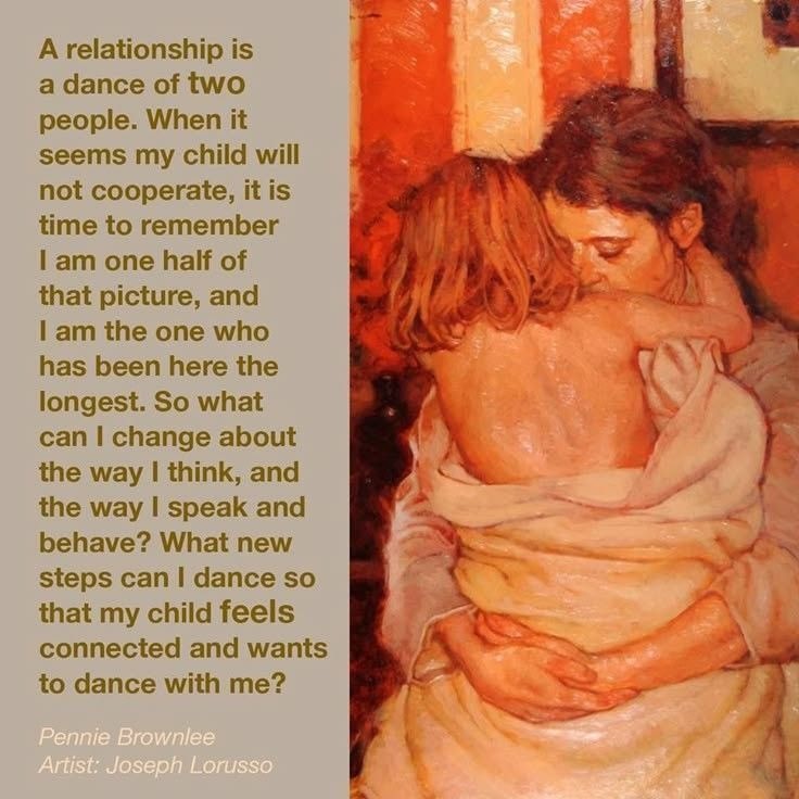 Một mối quan hệ là điệu nhảy giữa hai người. Khi con tôi có vẻ không hợp tác với mẹ, thì đó là lúc cần nhớ lại rằng tôi là một nửa của bức tranh, và tôi là người đã sống lâu hơn con. Vì vậy tôi có thể thay đổi điều gì về cách suy nghĩ của mình, cách nói và hành xử của mình? Tôi cần nhảy bước nhảy mới nào để con tôi cảm thấy được kết nối và muốn nhảy cùng tôi?