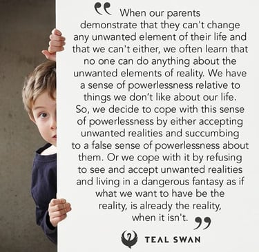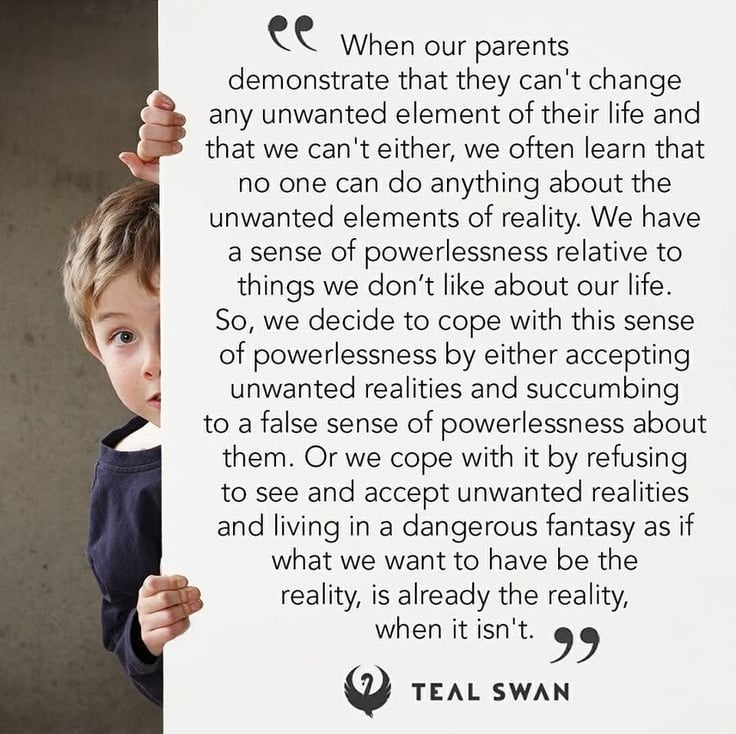 Khi bố mẹ chúng ta thể hiện rằng họ không thể thay đổi bất kỳ điều gì bất như ý trong cuộc sống và chúng ta cũng như vậy, thì chúng ta học từ họ rằng không ai có thể thay đổi những điều bất như ý trong cuộc sống. Chúng ta có cảm giác vô vọng, không thể thay đổi những thứ mình không thích. Vì vậy, chúng ta đối phó với cảm giác bất lực đó bằng cách chấp nhận hiện thực bất như ý và bị khuất phục trước cảm giác vô vọng. Hoặc chúng ta đối phó bằng cách không chấp nhận thực tế, và sống trong sự tưởng tượng nguy hiểm như thể những điều chúng ta muốn đã là thực tế rồi, trong khi thực tế thì không phải vậy.
