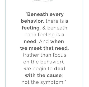 Bên dưới mỗi hành vi là một cảm xúc, và bên dưới mỗi một cảm xúc là một nhu cầu. Khi chúng ta đáp ứng nhu cầu đó của trẻ (thay vì chỉ tập trung vào biểu hiện hành vi bên ngoài), chúng ta bắt đầu giải quyết nguyên nhân, chứ không phải chỉ triệu chứng.