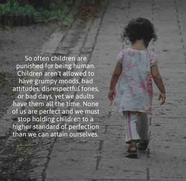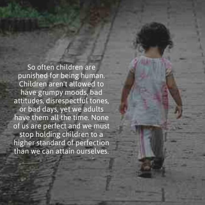 Rất thường xuyên trẻ con bị phạt chỉ vì chúng là một con người. Trẻ con không được phép cáu kỉnh, có thái độ tiêu cực, giọng nói bất cần, hay là những ngày tồi tệ, vậy nhưng người lớn chúng ta lại có quyền có những thứ đó mọi lúc mọi nơi. Không ai trong chúng ta là hoàn hảo cả và chúng ta phải ngừng bắt trẻ con làm theo những tiêu chuẩn hoàn hảo mà chúng ta thậm chí còn chẳng làm theo được.
