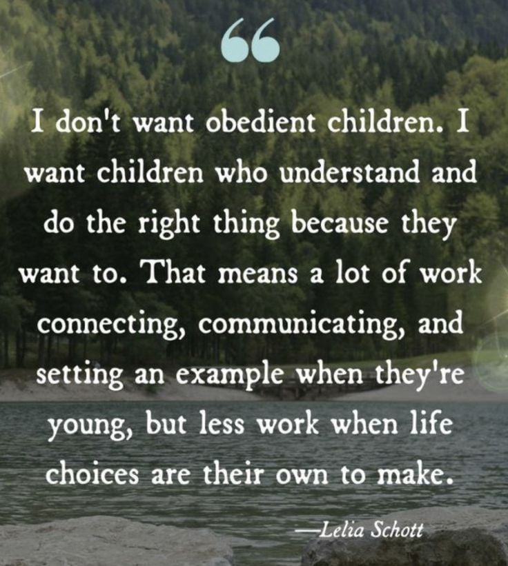 "Tôi không muốn có những đứa con ngoan ngoãn. Tôi muốn có những đứa con hiểu chuyện và biết làm điều đúng đắn vì đó là mong muốn của chúng. Điều đó có nghĩa là khi chúng còn nhỏ tôi cần làm rất nhiều việc: kết nối, nói chuyện với chúng, và làm gương cho chúng. Những việc này sẽ ít đi hơn khi các con lớn và tự ra quyết định được cho cuộc đời của chúng."